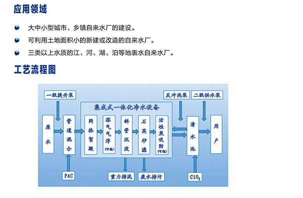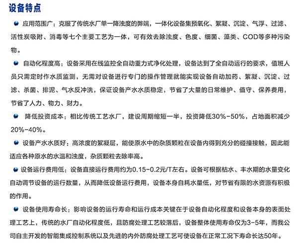 本設(shè)備是我公司總結(jié)多年經(jīng)驗(yàn),精心研制的新型產(chǎn)品,是集預(yù)氧化、絮凝、沉淀、氣浮、過(guò)濾、活性炭吸附、消毒等七個(gè)主要工藝為一體的高科技一體化水廠(chǎng)凈化處理設(shè)備。本設(shè)備不僅應(yīng)用范圍廣,處理效果好,出水水質(zhì)優(yōu)良,而且自耗水量少,動(dòng)力能耗低,占地面積小,安裝維護(hù)方便,整體投資少,便于擴(kuò)建增容,是新時(shí)代城市、農(nóng)村飲水工程最理想的凈水設(shè)備。