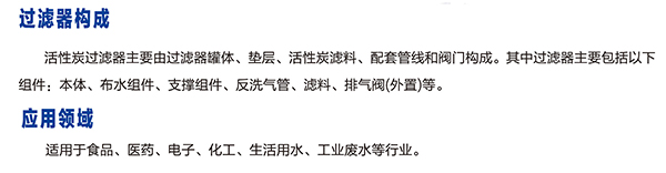 活性炭過濾器是利用活性炭的吸附原理,可有效去除色度、色味、有機(jī)物、細(xì)菌、膠體微粒、微生物,還可吸附氧、氨、溴、碘等非金屬物質(zhì),銀、砷、鉍、鈷、六價(jià)鉻、汞、銻、錫等金屬離子